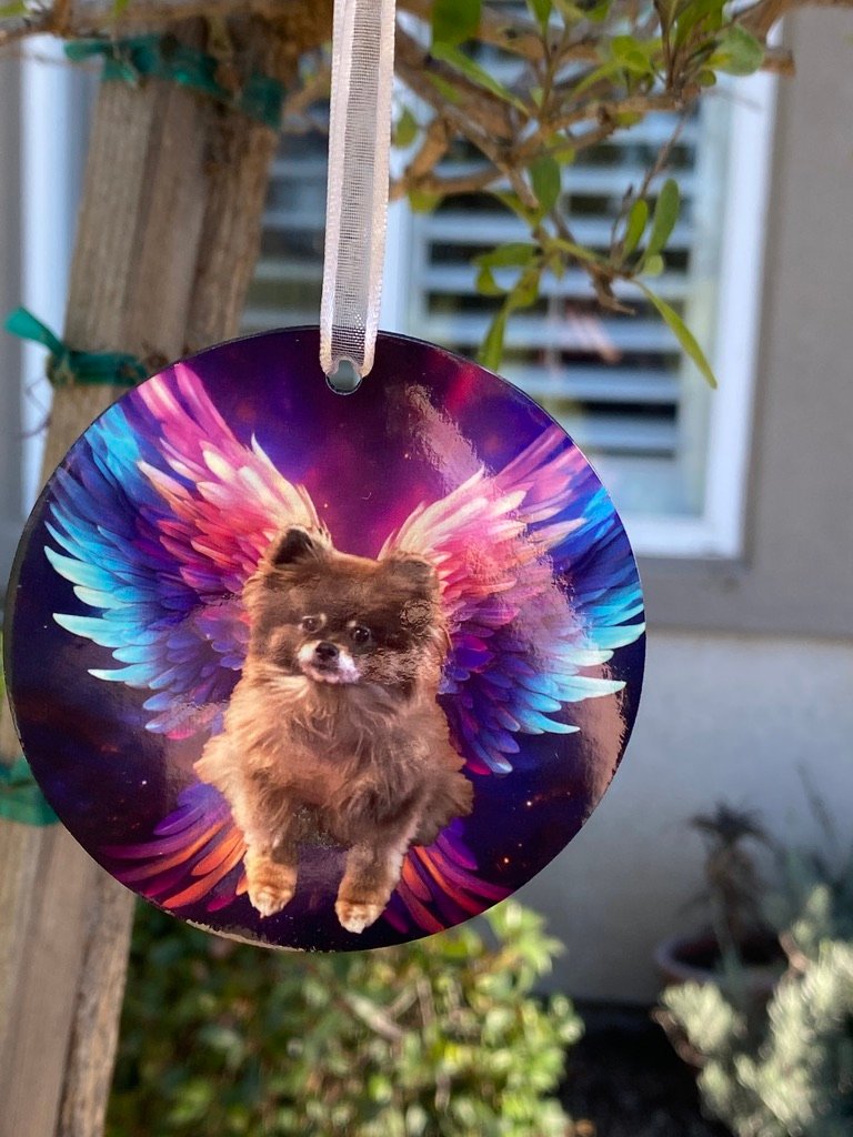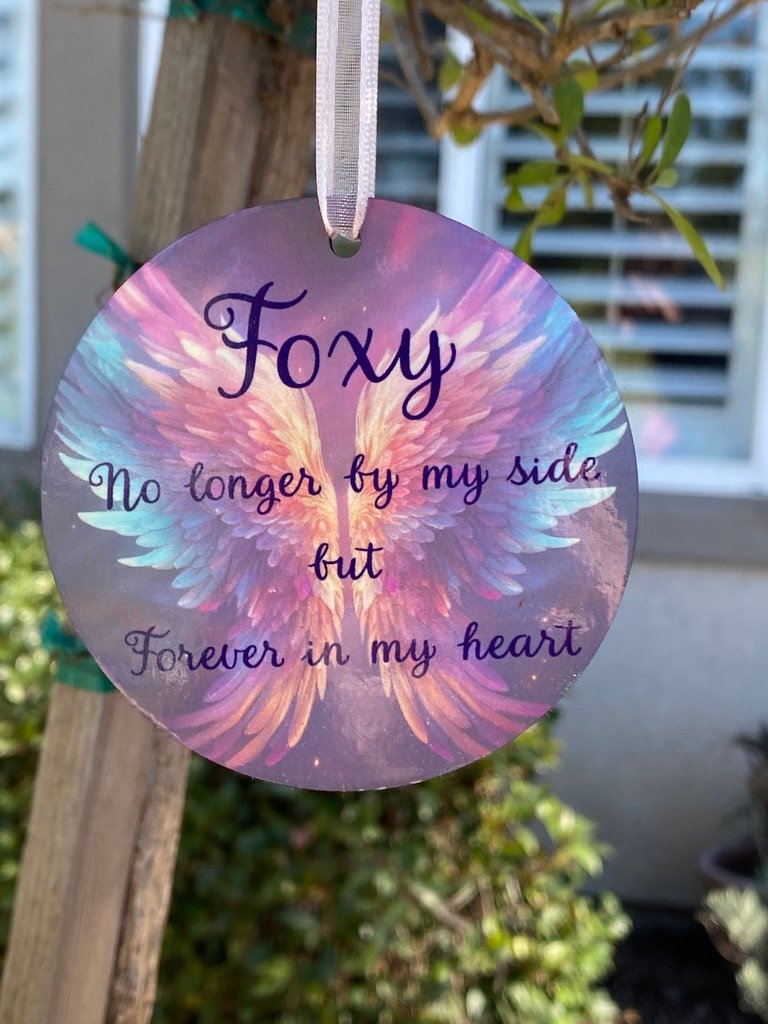 Honor your beloved pet with an angel wing background. Your pet on the front and their name on the back with “No longer by my side, but forever in my heart”.