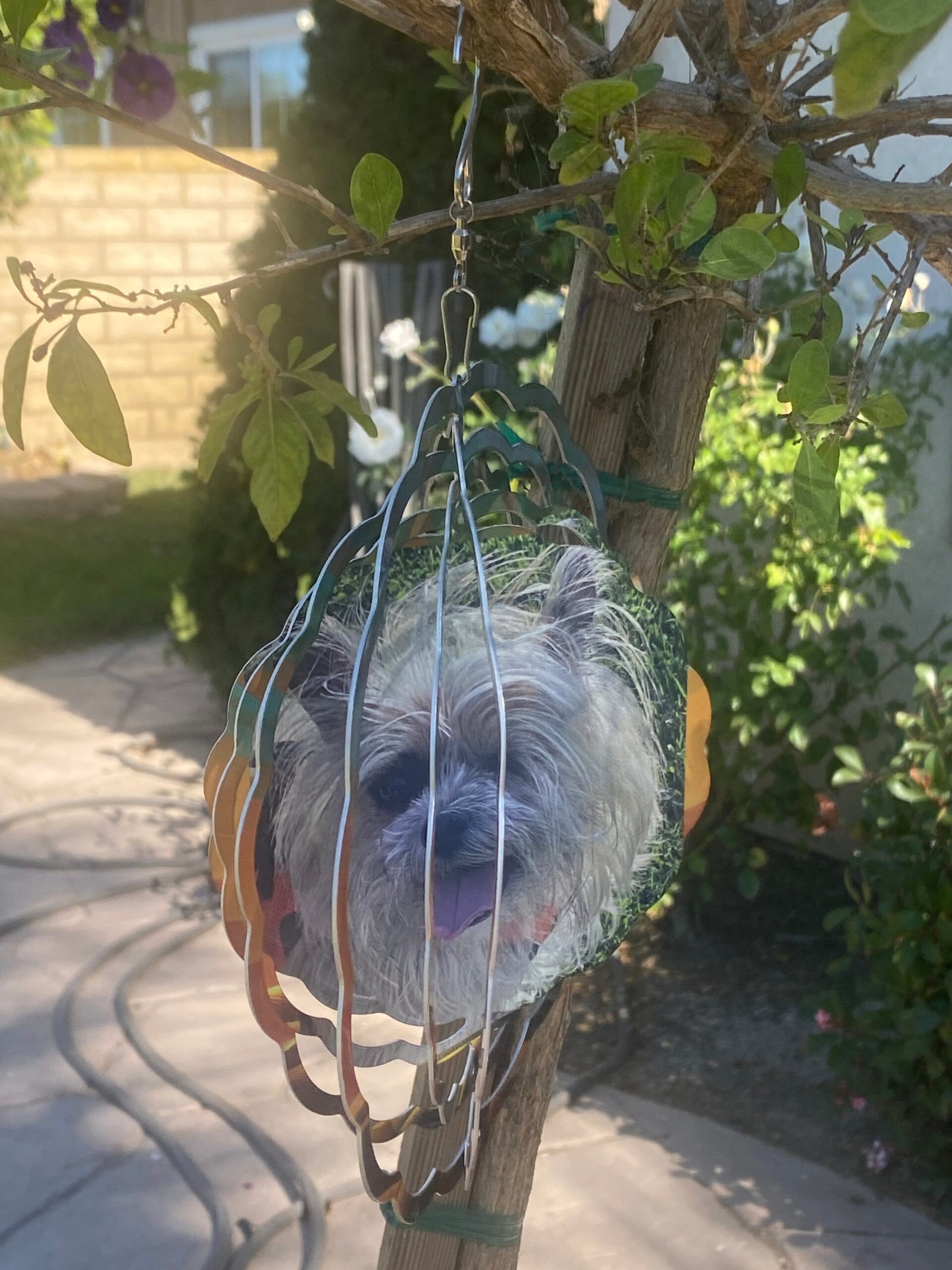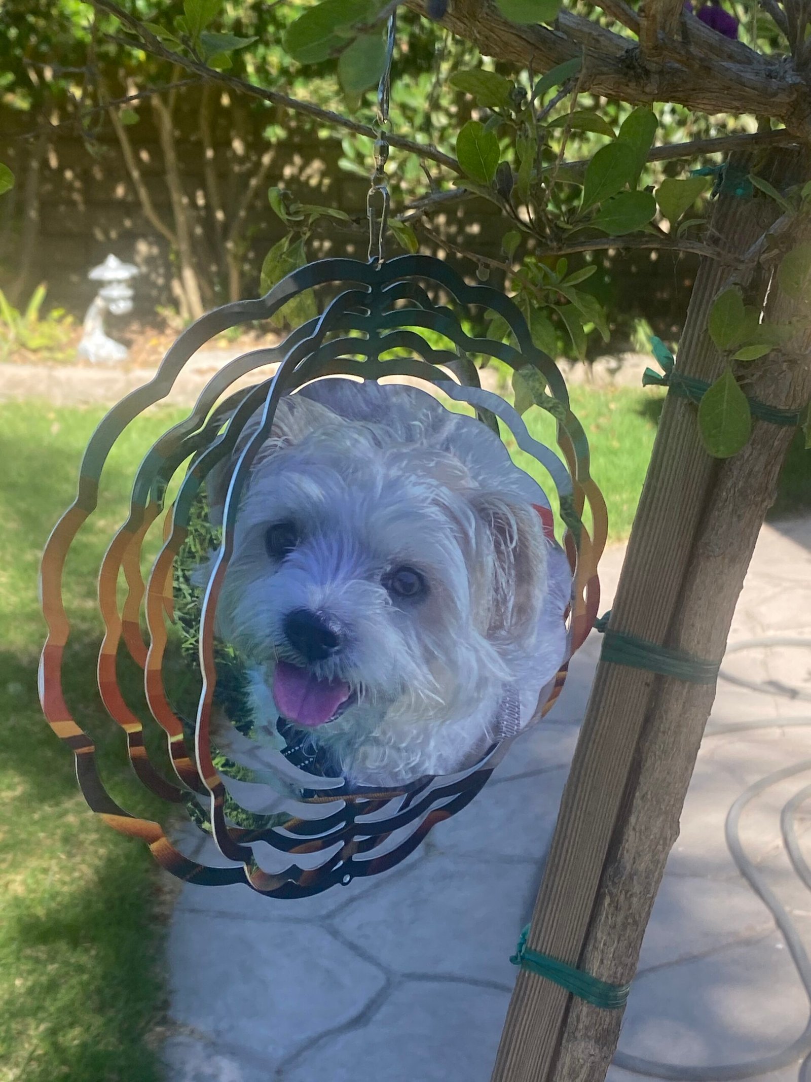 Add one photo or two of your furry friend. Enjoy this spinner indoors or outside. Hook included.